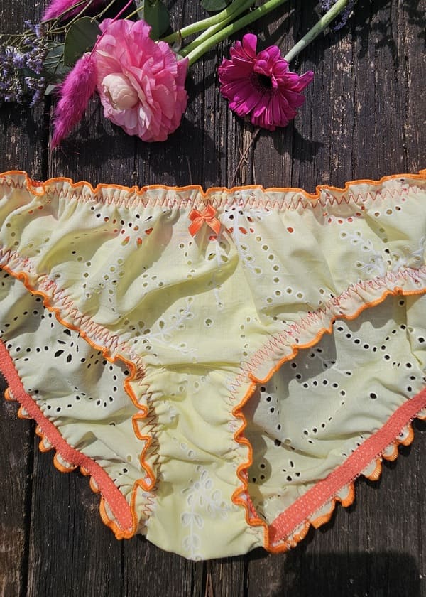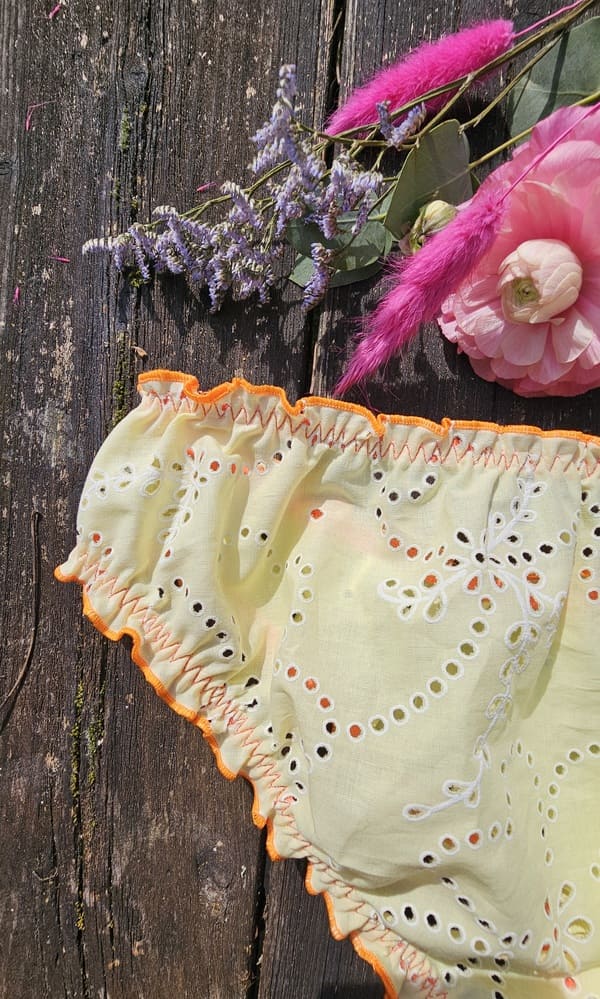 Le voile de coton jaune accueille de grosses fleurs crème ajourées, délicatement brodées. Chaque pétale laisse passer la lumière et crée un effet aérien. Ensuite, une bordure orange vive souligne la taille et les cuisses, apportant un contraste vitaminé qui fait toute la personnalité de ce bloomer.