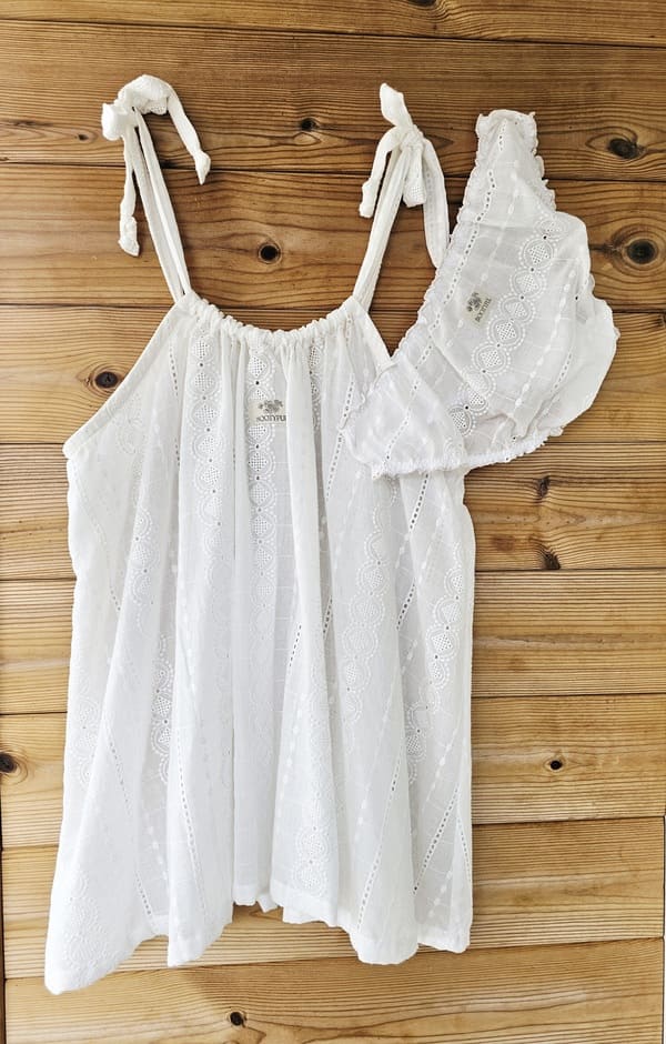 Confectionné en voile de coton blanc délicatement brodé, cet ensemble évoque la douceur des journées d’été, la lumière du soleil sur la peau et la pureté des instants suspendus.
