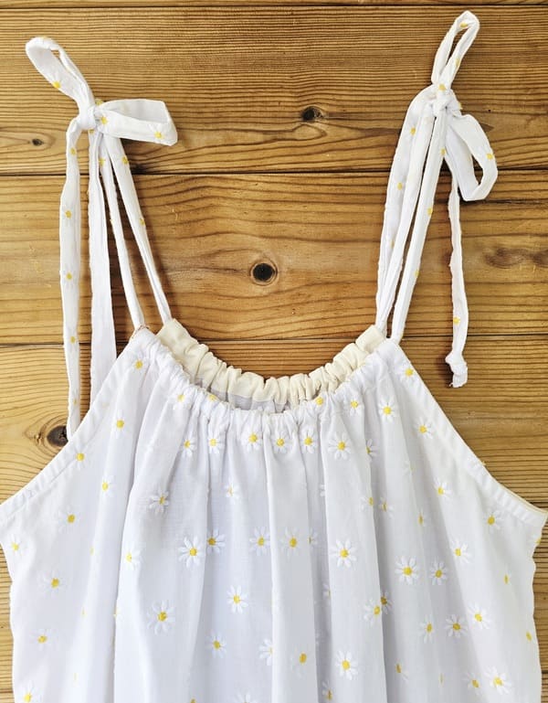 Robe MARGUERITE T.U en popeline de coton blanc, ornée de délicates marguerites brodées. Taille unique ajustable, coupe fluide et esprit bohème. Une création légère et poétique, cousue main en série limitée.